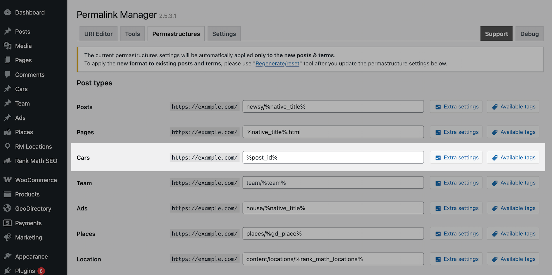 - Open the admin dashboard and navigate to "Tools -> Permalink Manager -> Permastructures".