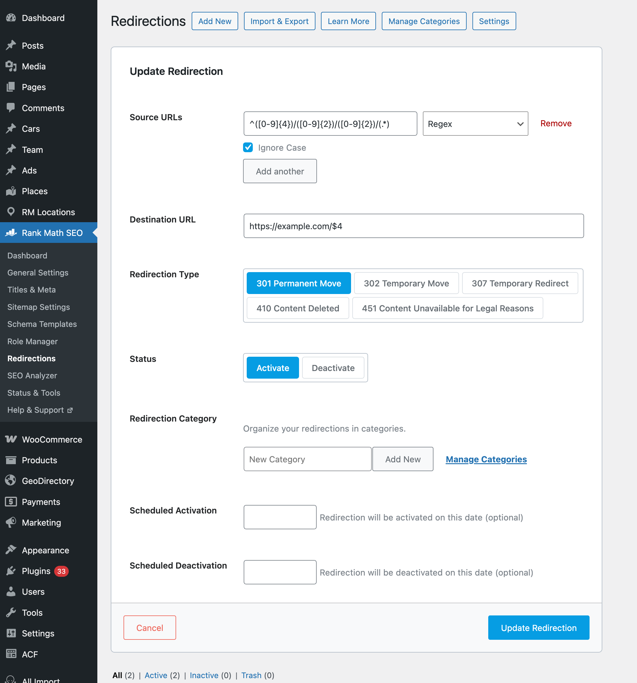 If you already have the Rank Math SEO plugin installed, you do not need an extra redirection plugin. Rank Math comes with a built-in Redirections module, which lets you manage redirects using REGEX rules.